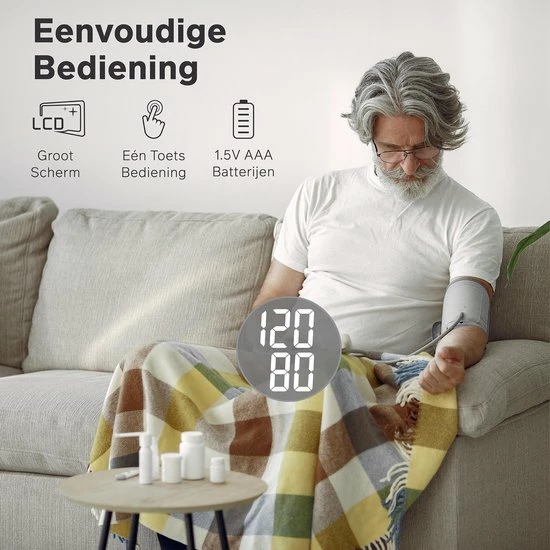 ? Inclusief Batterijen, USB – Oplaadsnoer en Manchet ? Nederlandstalige bijsluiter ? Makkelijk in gebruik ? Klantenservice 7/7 beschikbaar ? Slaat automatisch 240 gegevens op ? Detecteert onjuist aangebracht manchet ? Meet onregelmatige hartslag ? Meet gemiddelde over 3 metingen