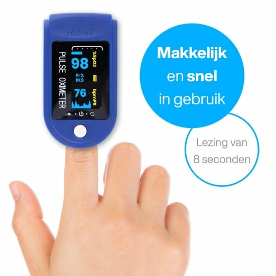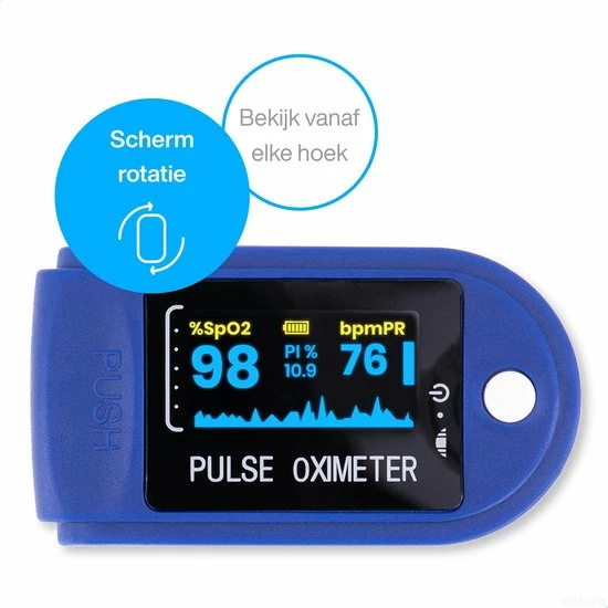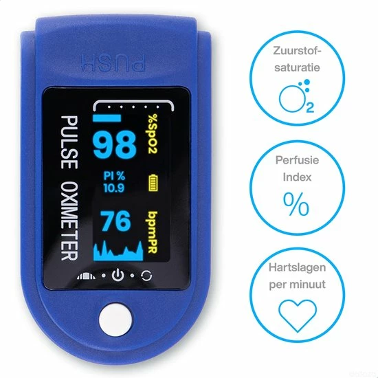 De saturatiemeter is een compact apparaat dat snel en eenvoudig het zuurstofpercentage in jouw bloed meet. De meter werkt eenvoudig door deze om de wijsvinger te plaatsen en op de startknop te drukken. Binnen enkele seconden heb je de uitslag op het scherm staan. Het scherm toont de zuurstofsaturatie (SpO2%), hartslagen per minuut(PR bmp), Perfusie-Index(PI) en een golfweergave van zuurstofsaturatie.