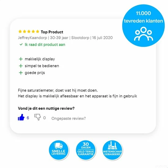 De ingebouwde perfusie-index (PI) meter maakt deze saturatiemeter extra accuraat. Ons model is uitermate getest op zijn nauwkeurigheid en betrouwbaarheid en is wetenschappelijk getest.