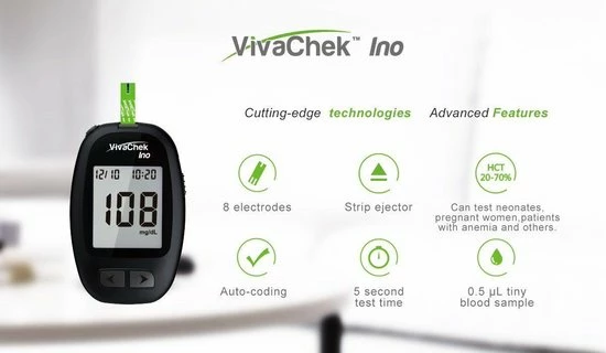 De VivaChek Ino is een bloedglucosemeter die eenvoudig te gebruiken is. De bloedsuikermeter heeft een opslagcapaciteit van 900 resultaten. In het menu kunt u aangeven of u voor of na een maaltijd heeft getest, hierdoor heeft u altijd een betrouwbare uitslag. De VivaChek Ino biedt u de beste prijs-kwaliteitverhouding en betrouwbare bloedsuiker testresultaten. De VivaChek Ino glucosemeter voldoet aan de ISO15197:2015 norm, dit houdt in dat deze aan de strengste eisen wat betreft accuratesse voldoet. De meter wordt geleverd met een Nederlandstalige handleiding.