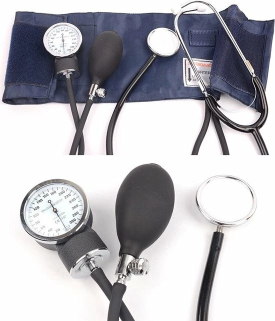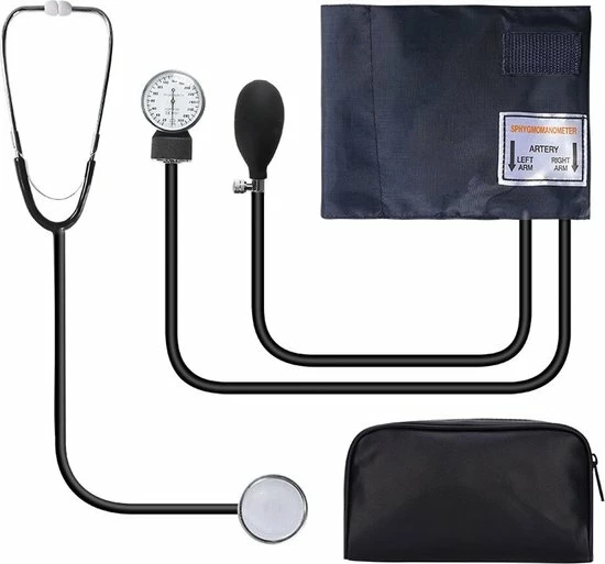 - Een complete set om de bloeddruk op te nemen met een kwaliteits stethoscoop. Wordt netjes verpakt in een zwarte kunstleren draagtas geleverd.