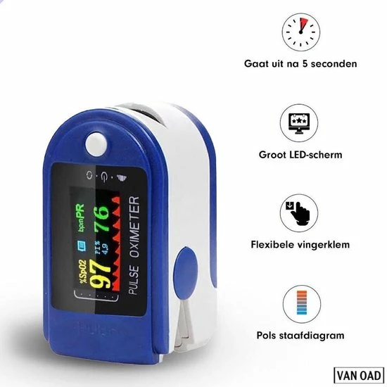 Ook altijd al eens willen weten wat jouw zuurstofsaturatie in je bloed is? Hoe hoog slaat mijn hart? Dat kan dus heel eenvoudig gemeten worden met deze vingertop zuurstofmeter. Deze saturatiemeter is bedoeld om snel en makkelijk jouw zuurstofgehalte en hartslag te meten. Door gebruik te maken van naukeurige infrarood kan deze professionele zuurstof & hartslagmeter in ??n de meting doen. U hoeft niet naar een specialist toe om uw saturatie te laten meten. Door heel gemakkelijk uw vingertop in de pulse oximeter te leggen krijg je binnen een paar seconden de resultaten op de display van de saturatiemeter te zien. Zorg er wel voor dat uw handen iets warmer zijn voor u de meting doet.