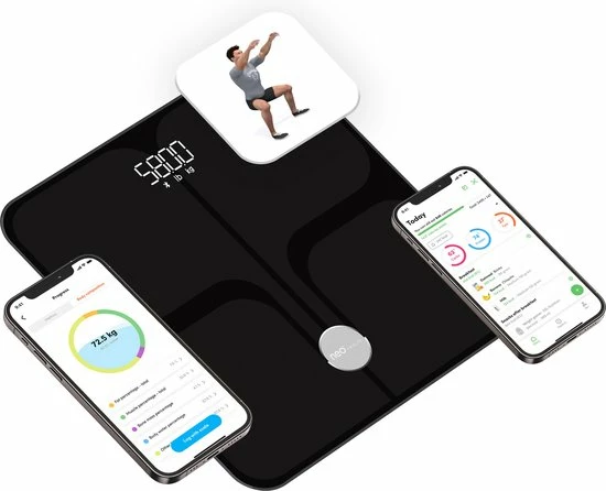 - Meet gewicht, vetpercentage, BMI, lichaamsvochtpercentage, vetvrije massa, vetmassa, vet (visceraal), spierpercentage, spiermassa, botmassapercentage, botmassa, metabolische leeftijd en basaal metabolisme.