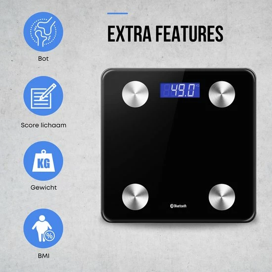 Houd uw voortgang bij – de Weegschaal maakt verbinding met diverse apps om u te helpen doelen te stellen, historische gegevens op te slaan en uw dagelijkse, wekelijkse en maandelijkse voortgang bij te houden. Download de App in apple app/google play werkt met Bluetooth.