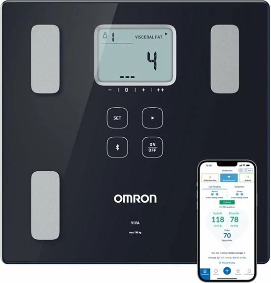 De OMRON VIVA is een klinisch gevalideerde weegschaal dat gebruik maakt van bio-elektrische impedantie (BIA) analysetechnologie om uw lichaamssamenstelling te beoordelen. De OMRON Viva is een digitale Slimme Personenweegschaal met App geschikt voor lichaamsanalyse met onder andere het vetpercentage en spiermassa.