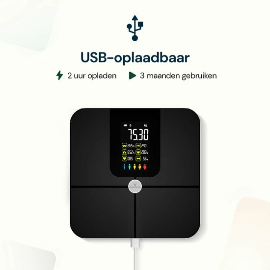 De Sacoma® personenweegschaal is voorzien van een krachtige lithium batterij is volledig oplaadbaar via USB. Deze duurzame accu gaat zo’n 2 maanden mee bij dagelijks gebruik en is binnen 2 uur weer helemaal vol.