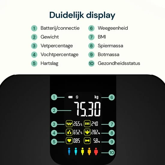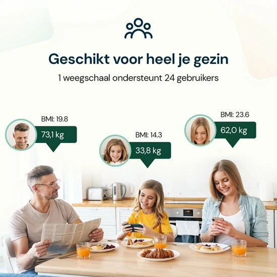 ✓ Geschikt voor het hele gezin – de memoryfunctie op de weegschaal gaat tot wel 100 personen.