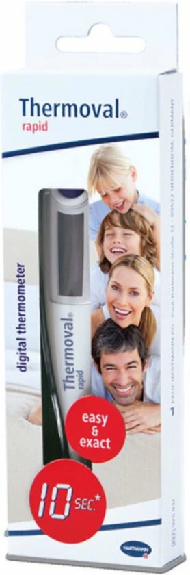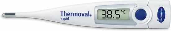 Elektronische koortsthermometer met een bijzonder korte meettijd van ca. 10 seconden; met extra groot digitaal scherm; akoestisch signaal dat aangeeft wanneer de meting gestart kan worden en wanneer de meting voltooid is; geheugenfunctie; schakelt automatisch uit; waterdicht en schokbestendig; kan ontsmet worden; met vervangbare longlife-batterij