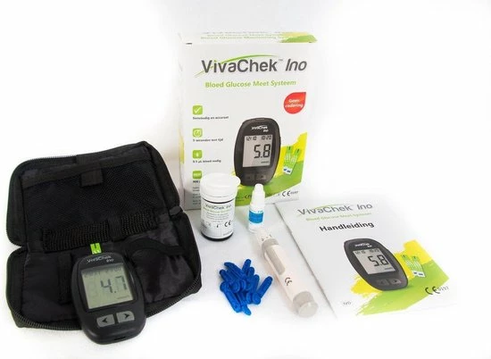 De VivaChek Ino is een bloedglucosemeter die eenvoudig te gebruiken is. De bloedsuikermeter heeft een opslagcapaciteit van 900 resultaten. In het menu kunt u aangeven of u voor of na een maaltijd heeft getest, hierdoor heeft u altijd een betrouwbare uitslag. De VivaChek Ino biedt u de beste prijs-kwaliteitverhouding en betrouwbare bloedsuiker testresultaten. De VivaChek Ino glucosemeter voldoet aan de ISO15197:2015 norm, dit houdt in dat deze aan de strengste eisen wat betreft accuratesse voldoet. De meter wordt geleverd met een Nederlandstalige handleiding.