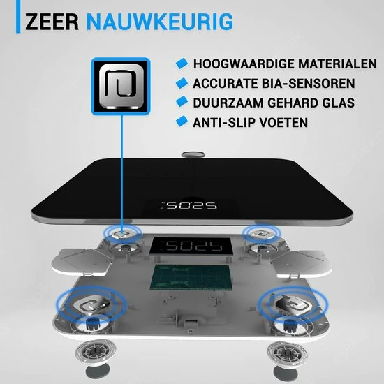 - Inhoud verpakking: 1 x smart weegschaal, 4 x AAA betterijen, 1 x handleiding.
